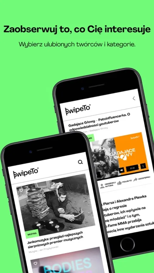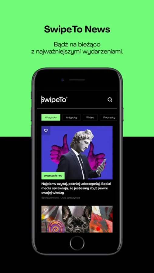 SwipeTo to aplikacja, w której znajdziesz wszystko, co ważne tu i teraz. Newsy. Popkultura. Lifestyle. Muzyka. Filmy. Seriale. Sport. Technologia. Gaming. Ekologia. Sprawy społeczne. Wszystko w formie, jaka pasuje ci najbardziej. Lubisz słuchać? Czeka na Ciebie kilkanaście podcastów. Wolisz czytać? Mamy mnóstwo artykułów, felietonów, analiz i recenzji. Jesteś wzrokowcem? Oglądaj nasze materiały video. Dużo treści, żadnych reklam. Tylko tu i teraz. Ściągnij i sprawdź.