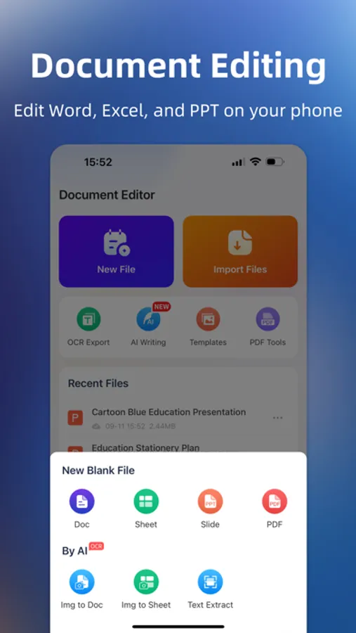 Document Editor integrates office document processor functions: Word, Excel Spreadsheet, Powerpoint and PDF Scanner, you can create, view and edit Word, Excel, PowerPoint and PDF files easily。
