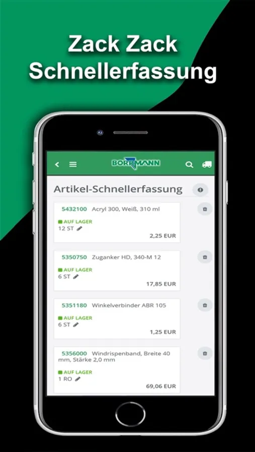 • Zack Zack Schnellerfassung via Scanner (separat erhältlich): Sie erhalten von uns Ihre gewünschten Etiketten für Ihre Lagerartikel und können somit via App und aufgelegten Bluetooth Scanner in Sekundenschnelle all ihre benötigten Artikel erwerben.