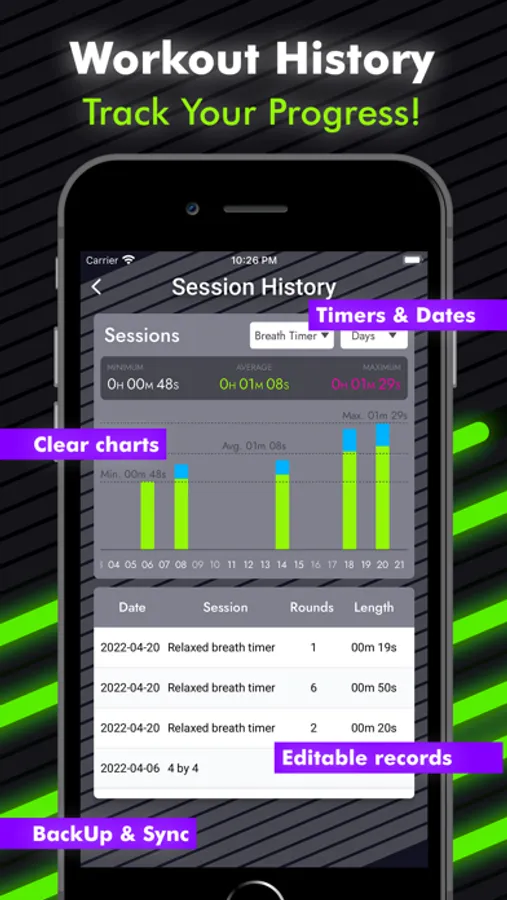 Top Timer contains 6 timers for most of your needs: workout, HIIT (Tabata), EMOM, Breath, Pomo doro, Countdown and Stopwatch. Clear visual and auditory indications of work and rest rounds, customizable timer presets with workout exercise names, workout history, color schemes and sounds.