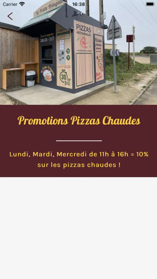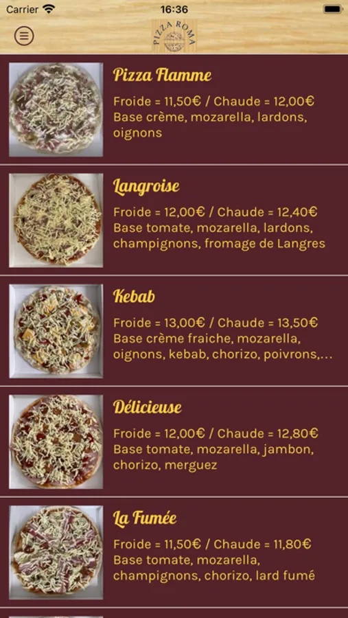 Sur notre application, vous retrouverez la carte des pizzas avec la liste des ingrédients et le prix chaud & froid, mais aussi nos promotions et votre code de fidélité avec ses avantages, etc.