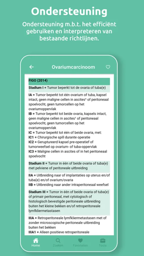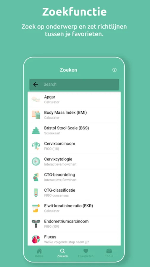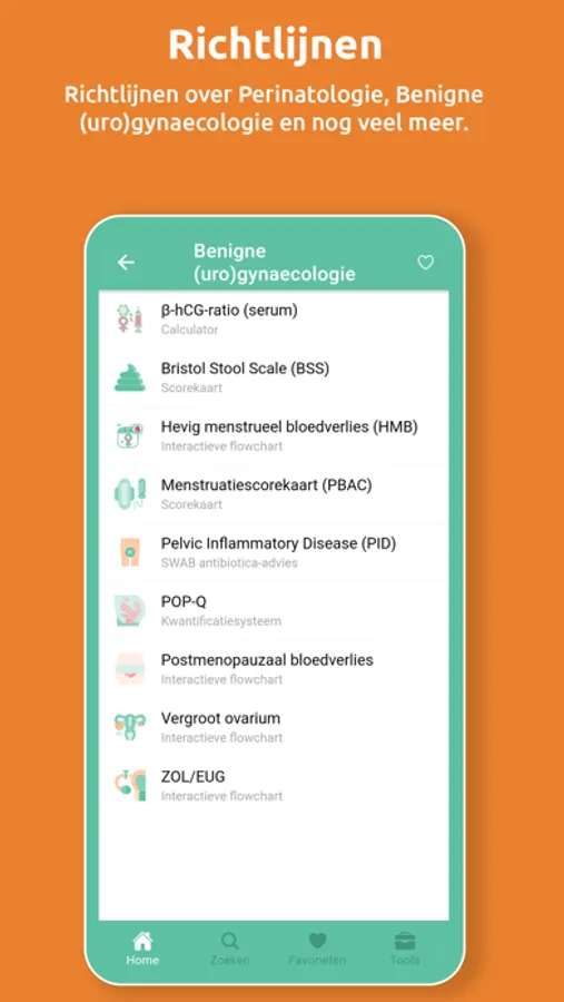 De Gynaecologie app is bestemd voor alle zorgverleners die betrokken zijn bij de zorg voor patiënten binnen de gynaecologie en verloskunde. Het bevat interpretaties van richtlijnen, inclusief interactieve flow-charts en handige calculators, die ook als ‘favoriet’ opgeslagen kunnen worden.