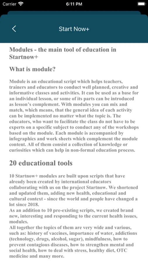 The Startnow+ application is a collection of educational modules devoted to health, well-being and the development of broadly understood social competences. It is dedicated to educators, teachers, facilitators, trainers, educators and animators - anyone who would like to conduct their classes in an interesting way, using the wealth of non-formal education methods.