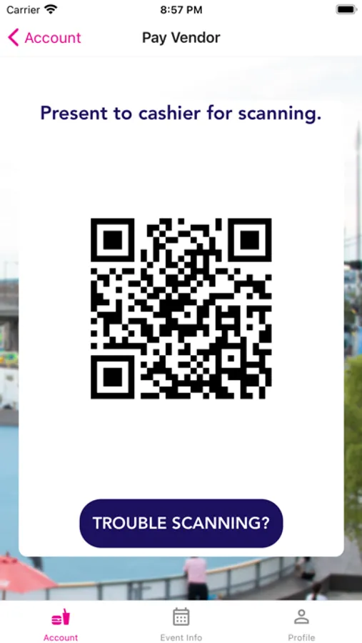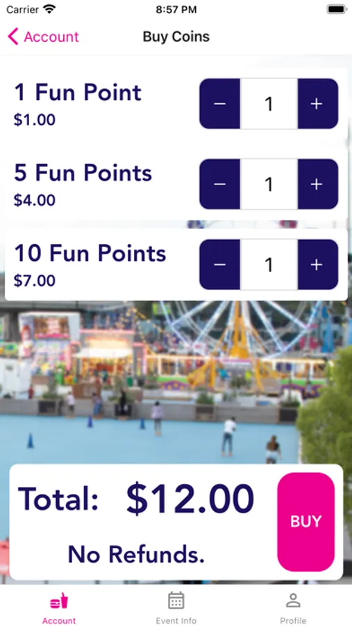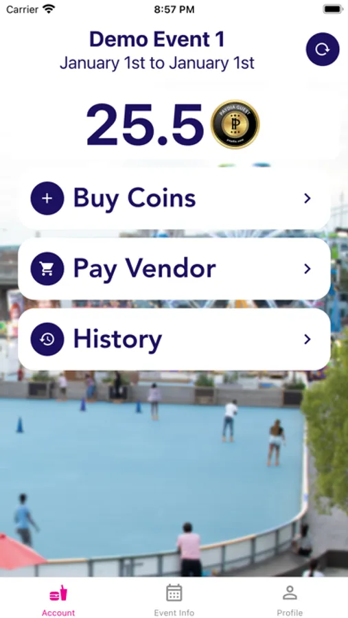 Paydia Digital Stored Value Solution Guest Side Features, including purchasing digital coins, and present QRCode to purchase from a vendor.