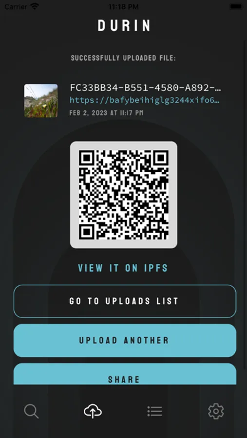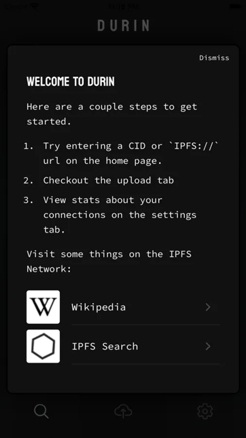 Durin enables you to fully utilize the IPFS network on your mobile device. It adds native support for IPFS + IPNS protocols so links on the web and in apps work seamlessly. You can also upload files to the network and view them within the app.