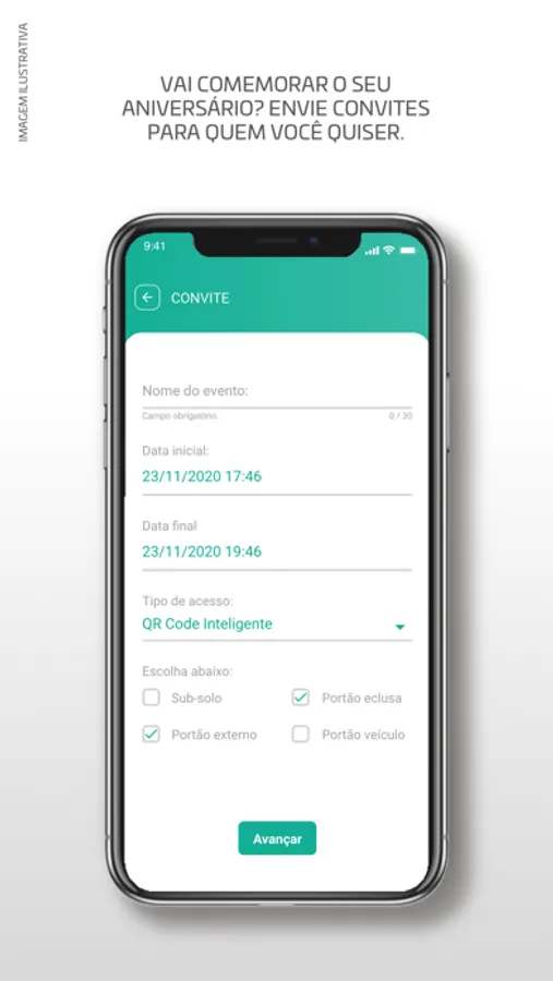 Possibilidade de o morador criar um evento e enviar convites para todos os seus convidados. Sempre que um dos seus convidado entrar ao condomínio, ele recebe uma notificação push no app.