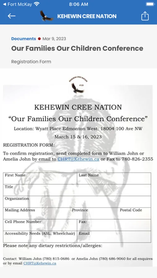 Users can utilize native iOS functionality to quickly and easily add posted events to their device calendar with one tap, as well as receive push notifications. Connect directly to the Band Office — submit requests, information, and questions that will be associated with your user account; make your voice heard! Authorize or reject documents sent by the Band Office, and issue corrections.