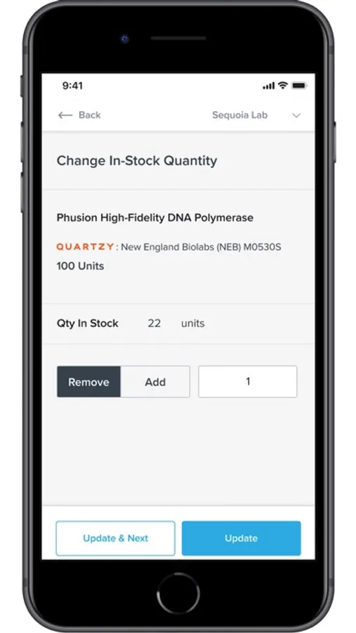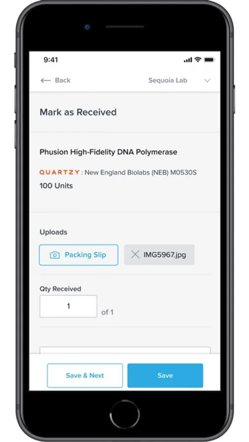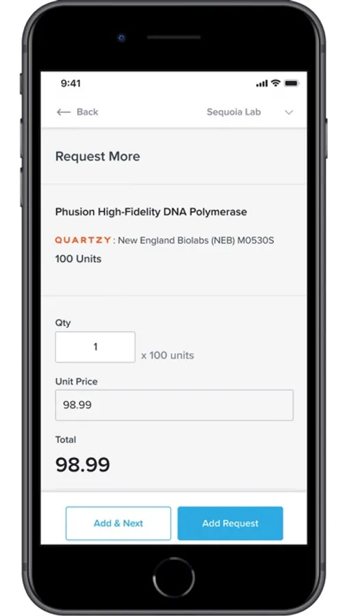 Quartzy Mobile App allows everyone in the lab to track inventory, creating a more up-to-date view of what is available in your lab, so supplies can be ordered in time and no experiment is delayed.
