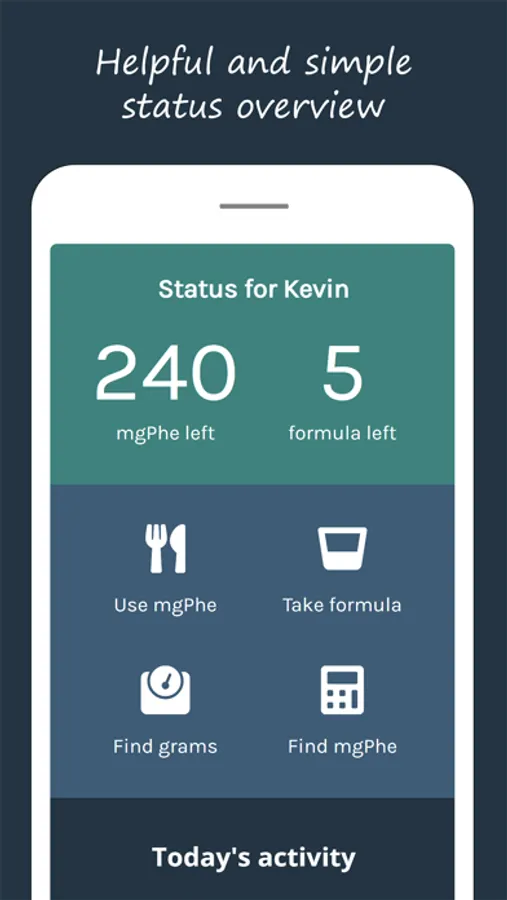 The app shows you exactly what you eat and how much Phe you have left to spend. It also supports exchanges. You can either update your status manually, or create your very own list of food and recipes. We haven’t forgotten about your formulas either.