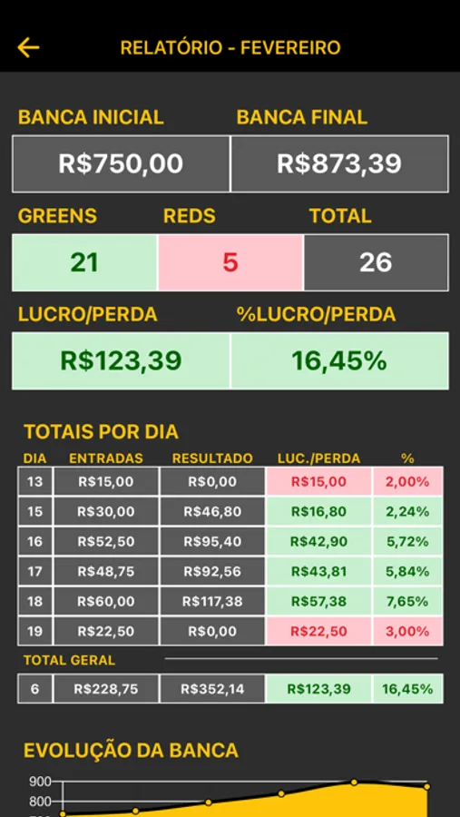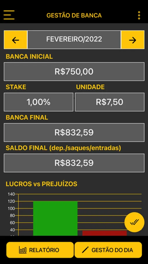 App Gestão de Banca para o controle de entradas no mercado de investimento esportivo. No App você irá cadastrar a banca, por mês e entradas do dia. Após as entradas, o App disponibilizará os percentuais, por meio de gráficos, dos seus lucros e perdas.