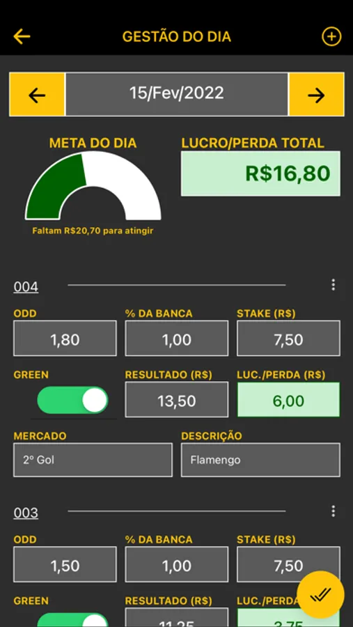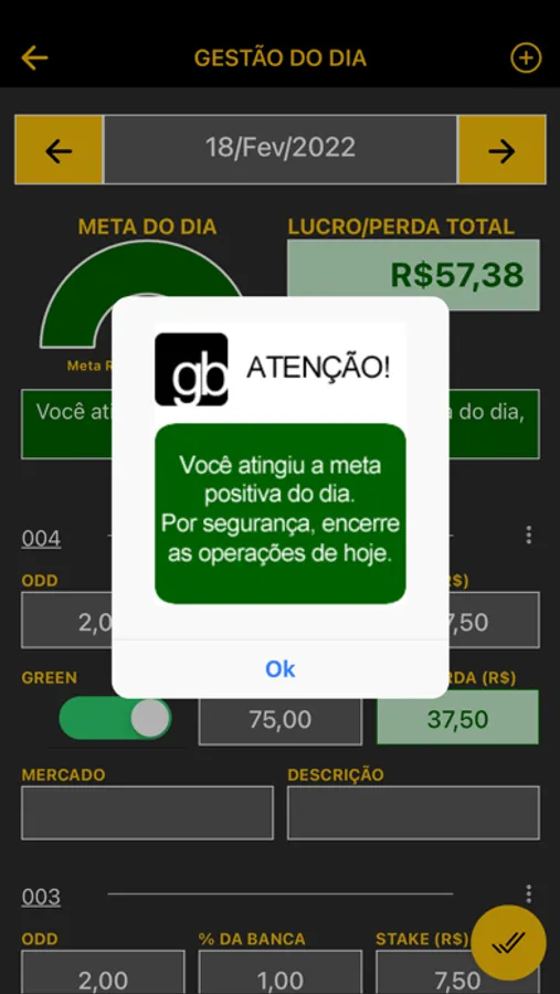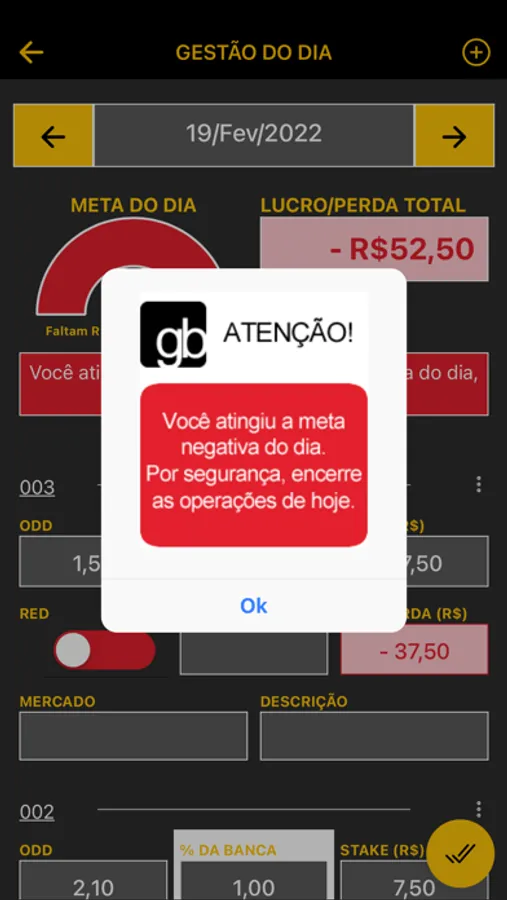 Você configura a sua meta, positiva e negativa, e o App vai te avisar o momento que deve pausar as operações do dia.