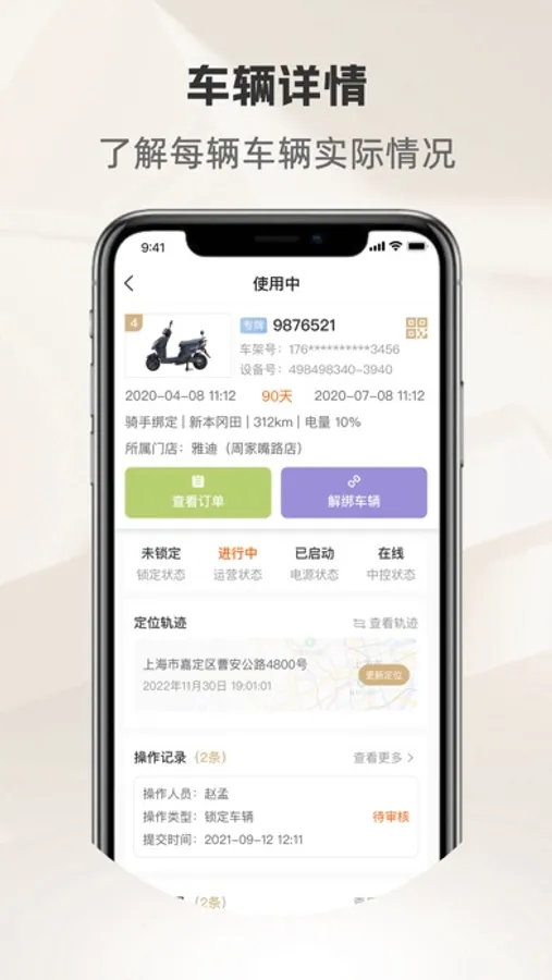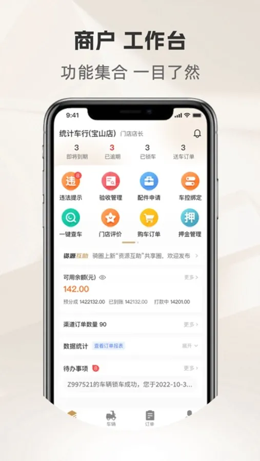 骑圈商户端是一款为商户管理人员提供包含车辆管理、车辆调度、维修管理、订单管理等功能的APP,商户管理人员可用骑圈商户端对商户的车辆、订单进行统筹管理。