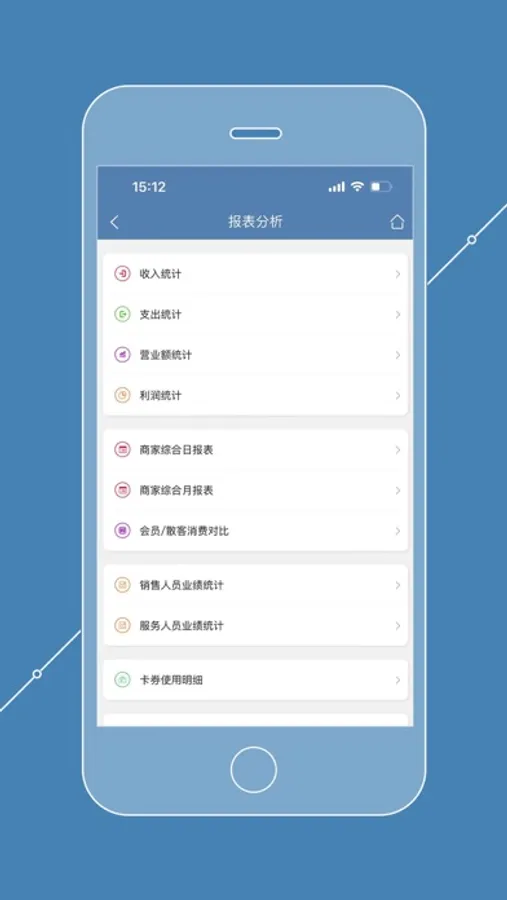 收入统计,利润统计,支出统计,日报月报,绩效提成,消费排行,充值排行,余额排行,积分排行,余次排行,销量排行,库存排行...