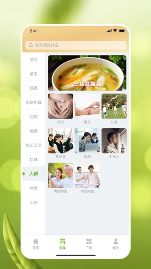 2-丰富的分类整合了:人群、疾病、功效、口味小吃等11种类型;