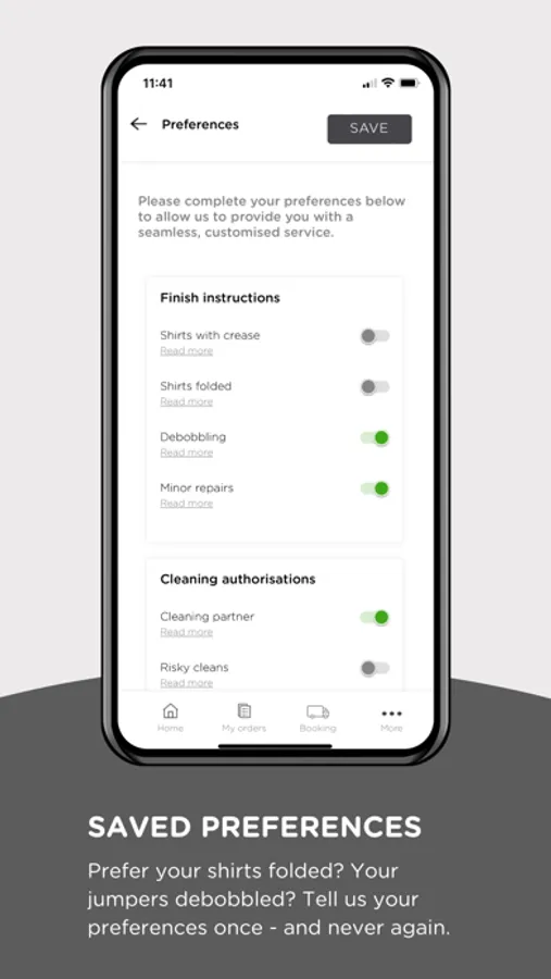 + Preferences menu: tell us all about how you like your shirts or jumper finished once, and we will never ask again