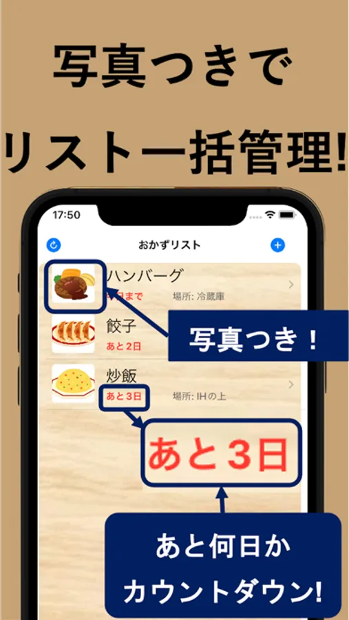 おかずの期限日当日になると、自動に通知でお知らせ!