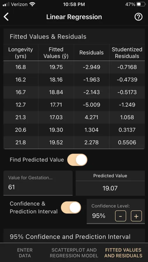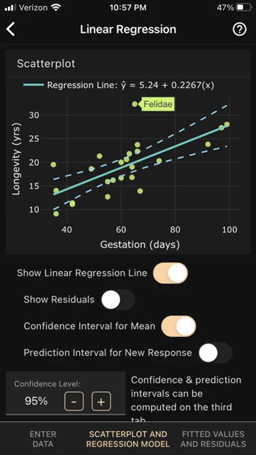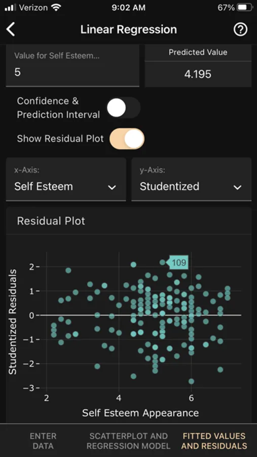The app computes confidence intervals for the mean response and prediction intervals for a future response. The fitted model and the intervals are visualized on the scatterplot, and you can obtain and plot raw and standardized residuals.