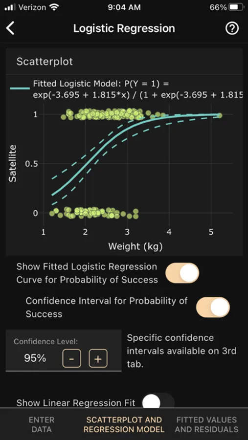 The Linear Regression app creates scatterplots, fits simple linear, logistic or exponential regression models, and conducts inference for model parameters (standard errors, confidence intervals, P-values).