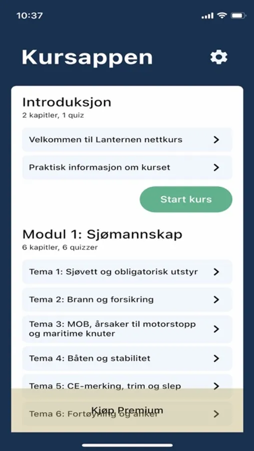 Båtførerprøven-kursappen er gir deg et fullverdig nettkurs som skal gjøre deg klar til å gå opp til båtførerprøven. Kurset er delt opp i kapittler som alle kommer med en egen quiz så du kan teste din egen læring.