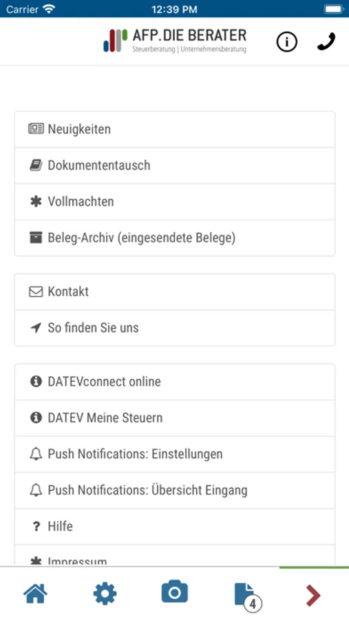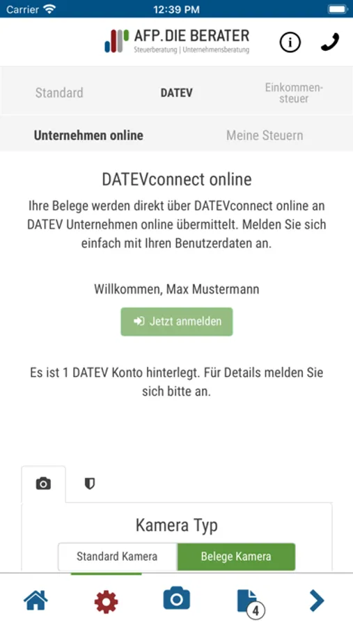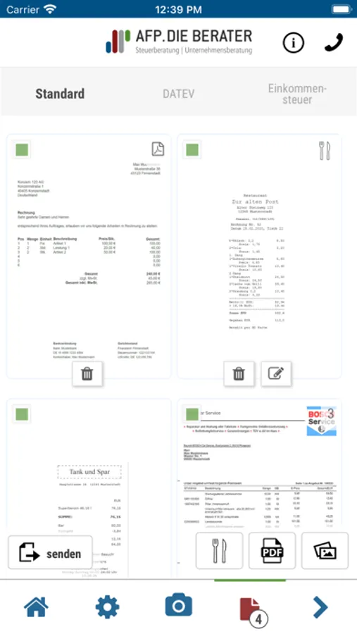 Machen Sie einfach ein oder mehrere Fotos von Ihren Belegen und versenden Sie diese mit einem Klick direkt aus der App heraus an Dr. Frevert & Partner GbR