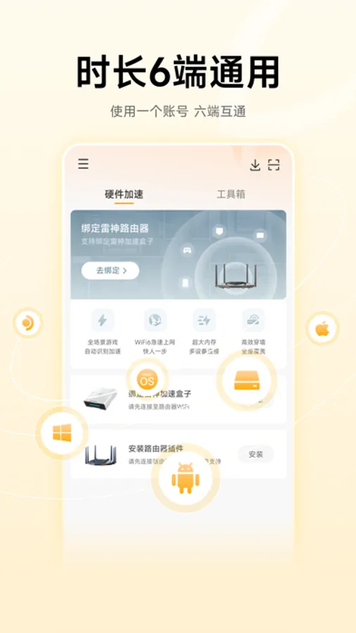 雷神加速器除海量手游加速外,支持绑定硬件设备(雷系电竞路由器A7000、N系电竞路由器A8000、加速盒子,以及路由器插件),支持全屋设备WiFi连接网络外,同时还提供连接路由器进行游戏加速(PC、手机、PS、Switch、Xbox),真正实现一站式加速管理服务。
