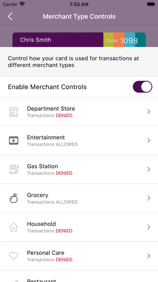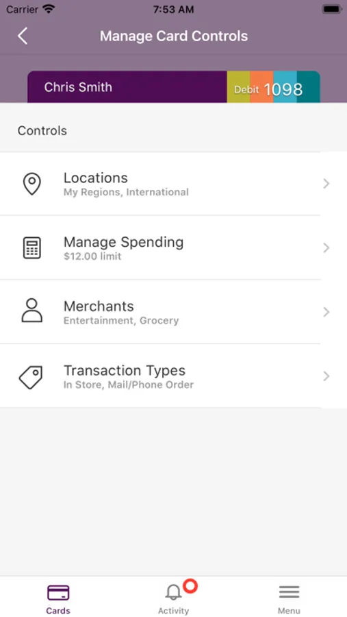Keep your card safe from unauthorized purchases by restricting international purchases, certain merchant types or by your location using location services.