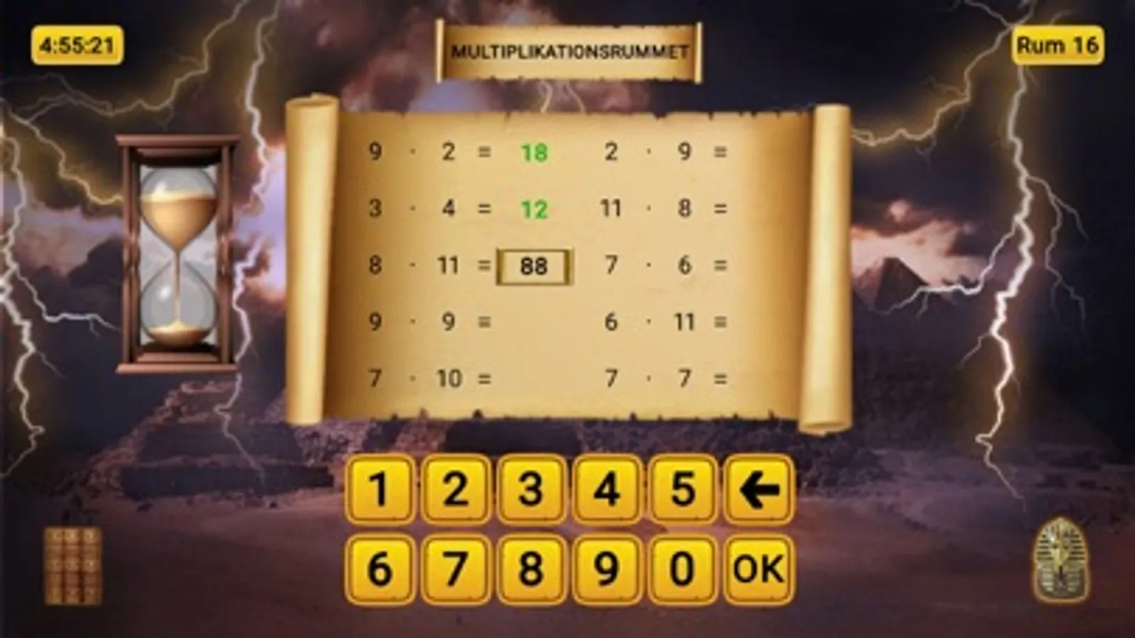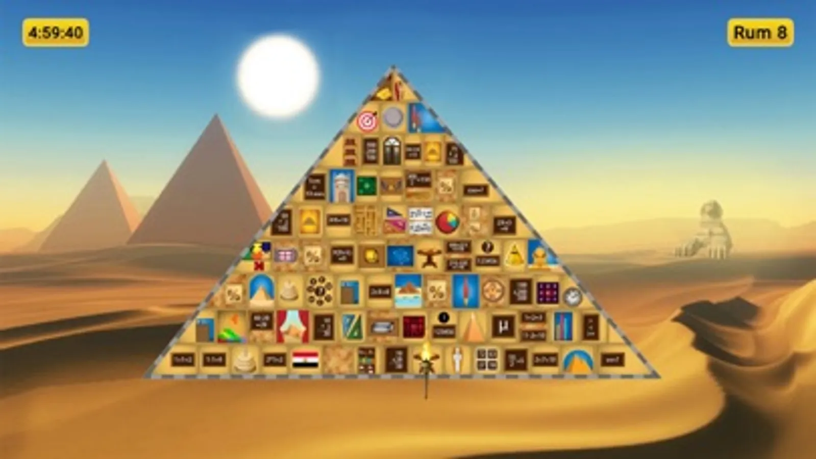 I rummen finns mängder av matematik främst från grundskolans högstadium: huvudräkning på de olika räknesätten, procent, geometri, ekvationer, talföljder, logik och mattespel men även en del frågor om pyramider och Egypten. Det är lätt i början men blir allt svårare ju högre upp du kommer i pyramiden.