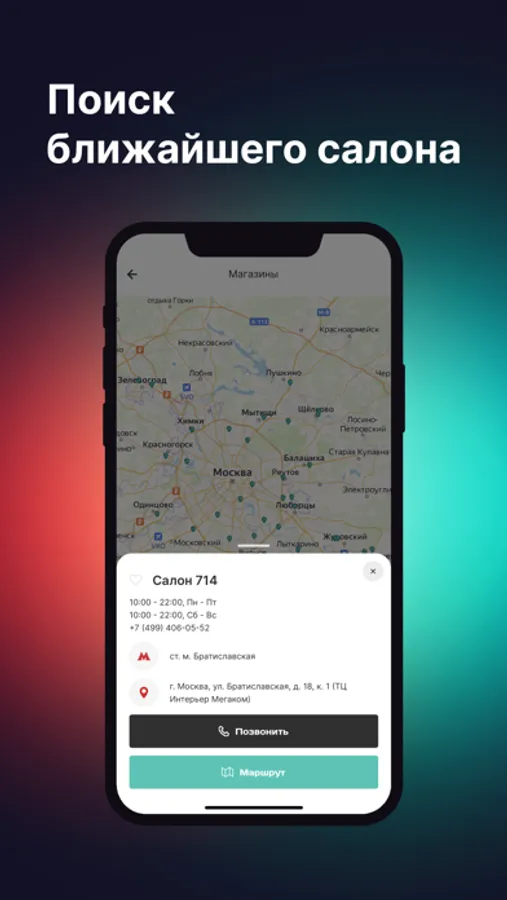 - найти ближайший салон «Цвет диванов» на карте, узнать адрес, телефон и режим работы