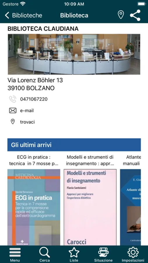 • consultare l’elenco biblioteche e mappa con relative informazioni (indirizzo, orari…)