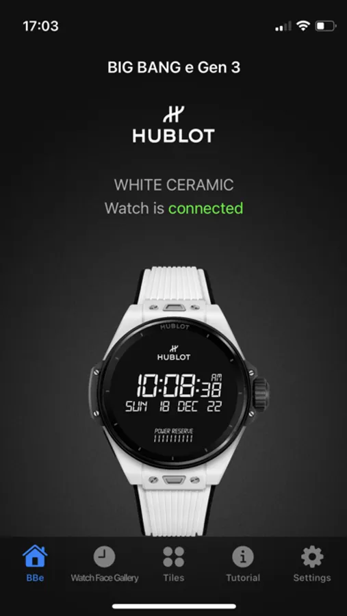 This app is required to connect your Hublot Big Bang e Gen3 to your smartphone. Once paired with the watch, you can scroll and display the watchfaces or configure your notifications preferences and more settings.