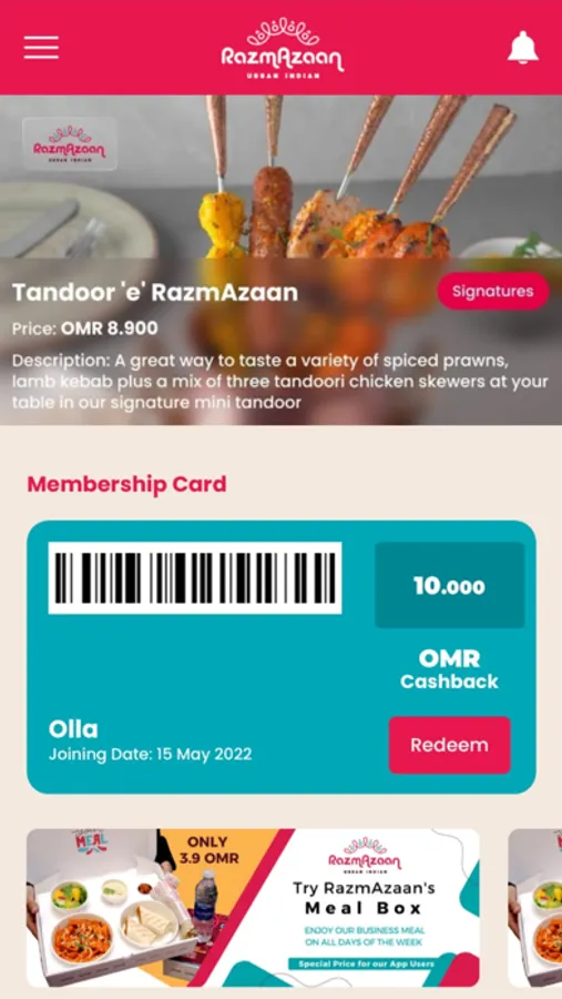 A customer loyalty application by RazmAzaan for its customers to earn RazmAzaan loyalty Cashback against their purchase across all RazmAzaan Outlets. Customers can earn and redeem Cashback using this application and also place Orders for delivery and takeaway by keeping a track of the latest offers.