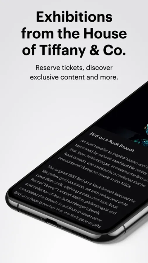 Journey through 185 years of Tiffany & Co. with the exhibition app. Access your free tickets to the exhibition, discover exclusive content—including Curator’s Choice objects and the Audio Tour—try on jewelry in AR and more.