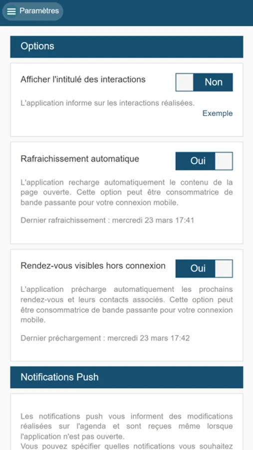 Synchronisé avec votre agenda GID pour une utilisation mobile collaborative avec vos collègues, votre secrétaire ou votre télé-secrétariat vous accéderez à l'ensemble des services :