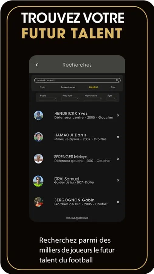Utilisez notre App’ et nos outils pour optimiser votre recrutement de joueurs en ayant accès à notre base de données joueurs et à nos datas joueurs.