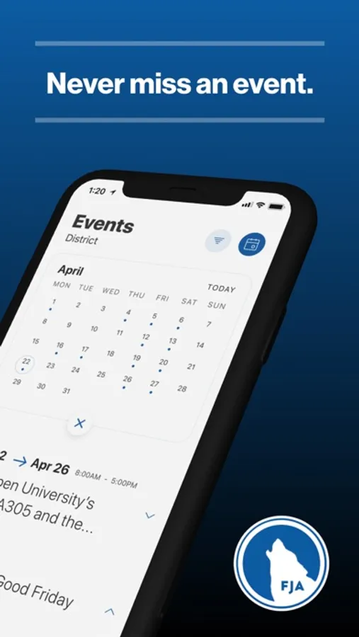 The event section shows a list of events throughout the district. Users can add an event to their calendar to share the event with friends and family with one tap.
