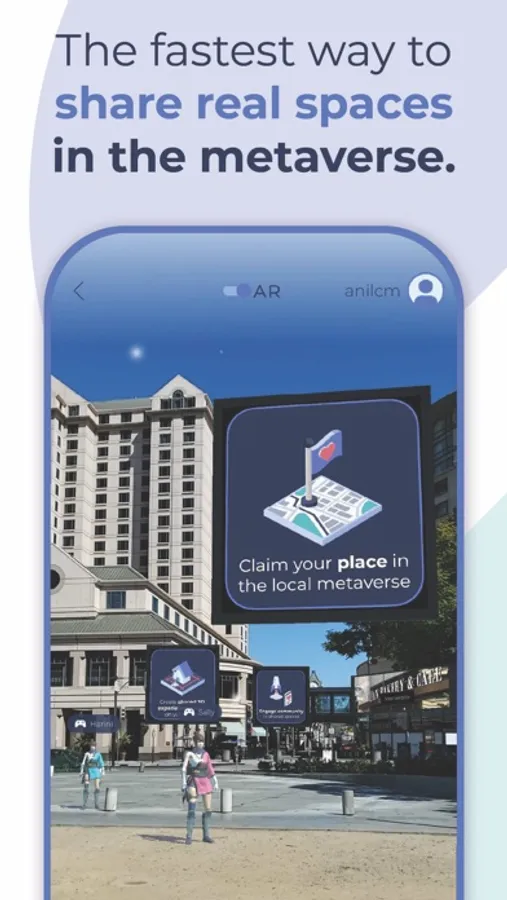 Claim you place in the metaverse - pick a real-world location, add photos, links and notes, and invite friends to your own Shared Space. Visitors to the physical site view an Augmented Reality experience, while virtual visitors explore inside a 3D Digital Twin of the city.