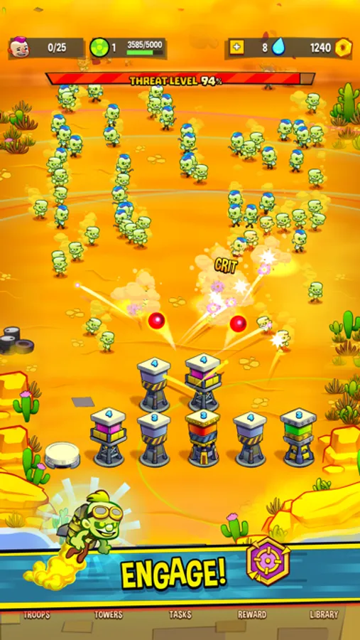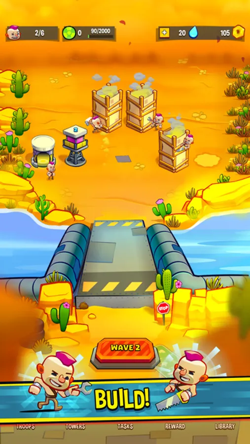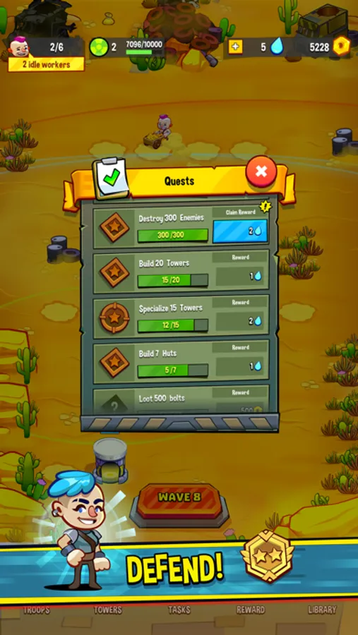 Besides building war towers, this free TD game also has idle tower defense elements as you can create and hire idle workers to collect and store bolts from fallen enemies. Build as many huts as possible, as this is where your workers will store the bolts. Then use the bolts to get more workers and build more towers, you’ll need them in the dangerous tower action waves in the later stages.