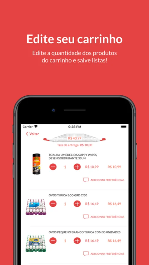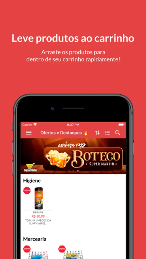 • Adicionar produtos no seu carrinho com um simples tocar e arrastar.