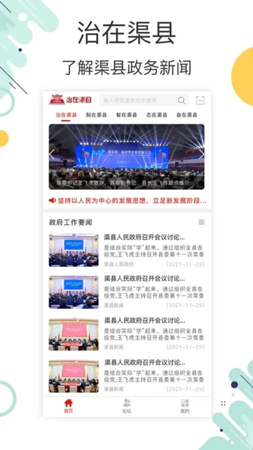 治在渠县旨在打造渠县本地的综合性服务平台,包括:新闻资讯、论坛交流、优选商城、忘忧IP、渠县风情、便民服务等功能。