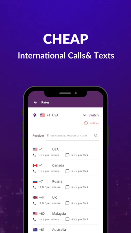 International call & SMS services supports 20+ countries: United States, Canada, Russia, United Kingdom, Malaysia, Australia, Indonesia, Philippines, New Zealand, Singapore, Thailand, Japan, South Korea, Vietnam, Myanmar, Hong Kong, Cambodia, Laos, Taiwan, and United Arab Emirates