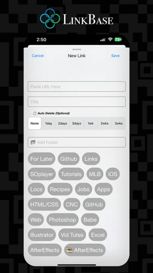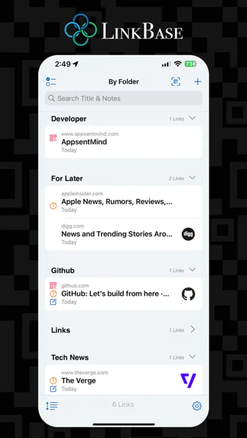 1. **Saving URLs**: saving your URLs or links just got easier. Wether you constantly scroll social media app and want to save posts or save video tutorials links for later, LinkBase has you covered. Save any type of URL, even location links from Maps app. When using iOS’s built in sharing capabilities choose LinkBase from the list provided (easiest and most used way) or scan QR Codes directly from within the app.