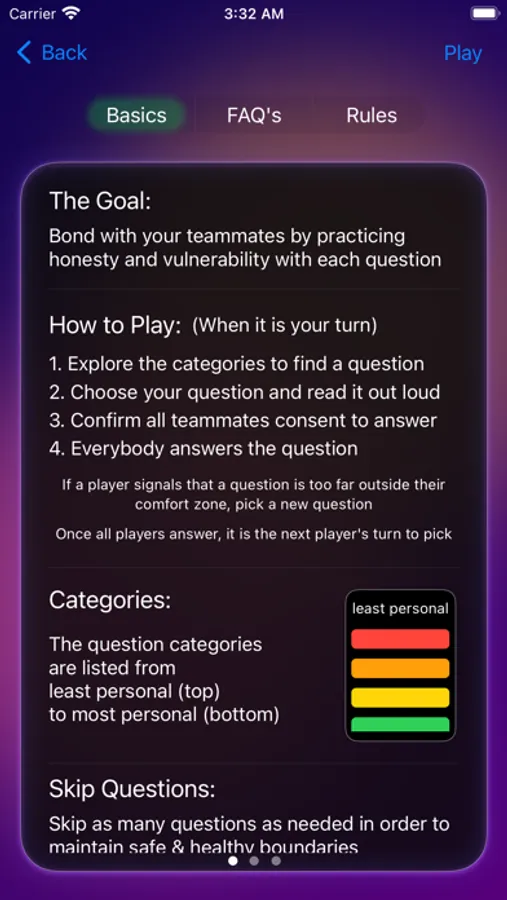 Whether you want to have a deep conversation or just break the ice, We Love Trauma is designed for all comfort levels. The range of categories allows you and your teammates to play the game at whatever level is suitable for you, and users are empowered to skip any questions outside of your comfort zones.