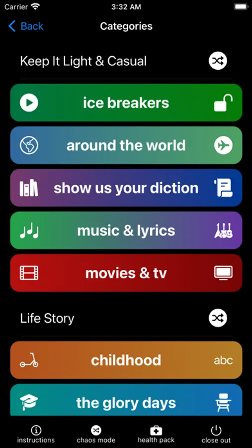For those times when you and your team are feeling extra spicy, you can play the questions of shuffle. There are multiple shuffle modes to provide a balance of spontaneity with the need to maintain safe and healthy boundaries.