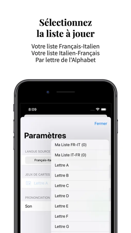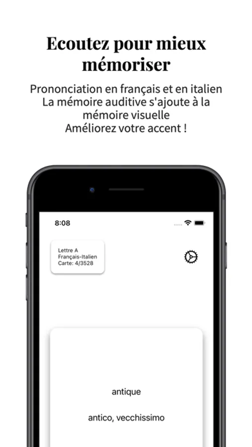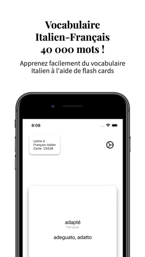 Cette application vous pemettra d’apprendre ou de réviser le vocabulaire Italien en feuilletant des cartes de vocabulaire (“flash-cards”). Essayez de deviner la traduction du mot ou de l’expression présenté, puis, un tap sur la carte et la traduction apparait en dessous aussitôt. Une méthode agréable et efficace pour apprendre des mots et expressions en italien à son rythme. Un balayage (swipe) à droite ou à gauche vous permettra de passer à la carte suivante.