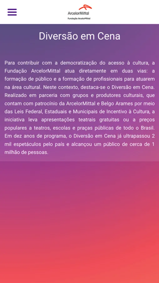 Este é o aplicativo do programa cultural DIVERSÃO EM CENA. Nele você pode acompanhar a agenda de atrações e fazer as solicitações de ingressos, assim como rotas para os locais das apresentações e links para assistirem os vídeos dos espetáculos.