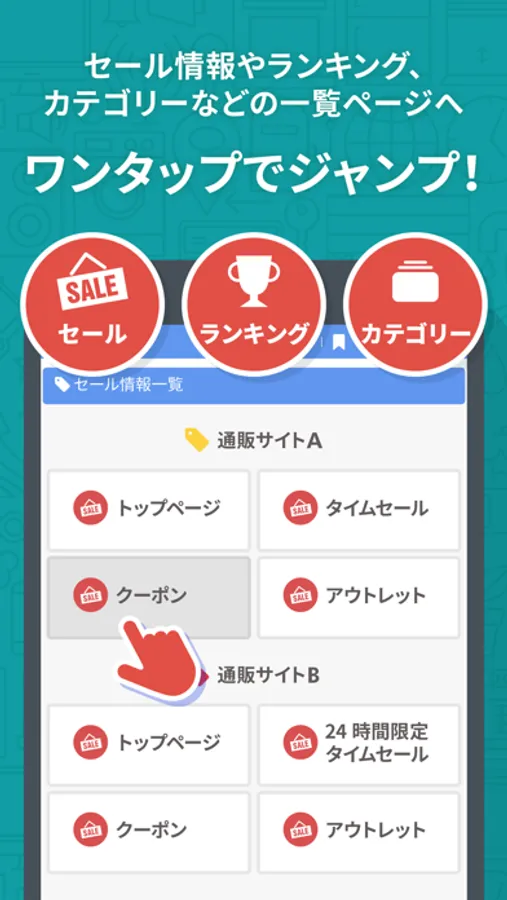 セール情報やランキング、カテゴリーなどの一覧ページへワンタップでジャンプ