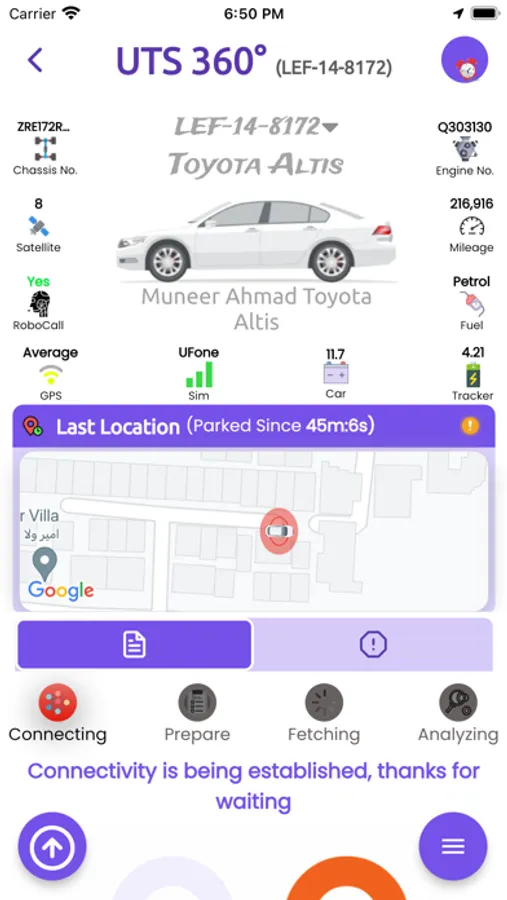 • Vehicles List: All the user vehicles have been shown in the form of a list. Click at any vehicle registration number to view its data.