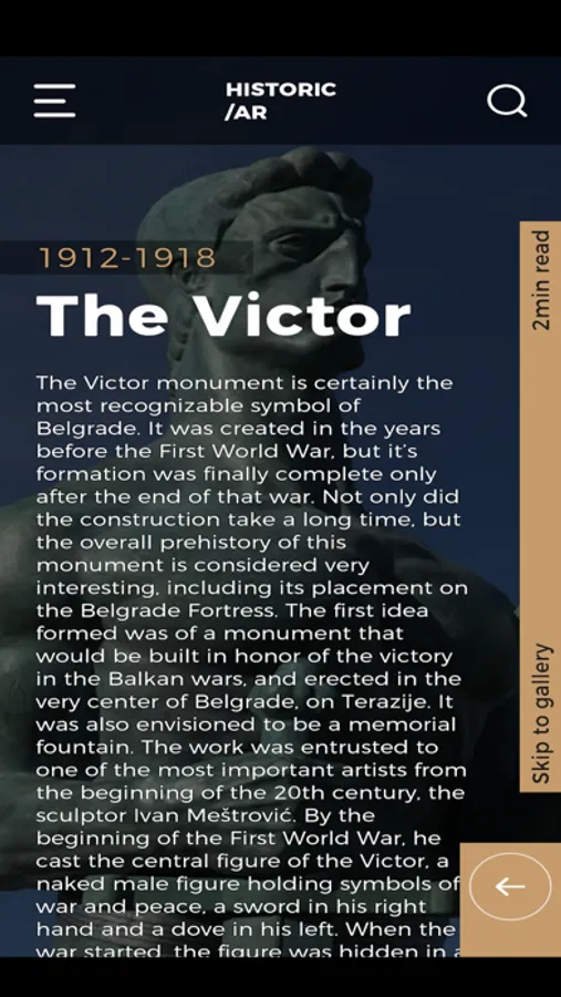 Digital tourist guide. We use location to navigate user to certain monuments, application then utilises augmented reality to bring history to life. We also use object recognition to scan monuments and provide additional information about them. Currently all listed monuments are located in Belgrade, Serbia.