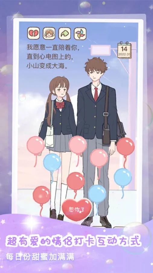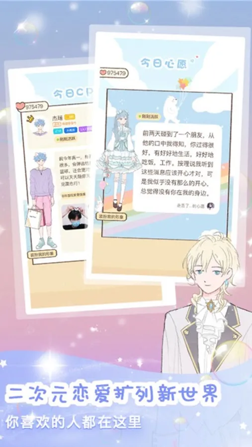 欢迎来到Z世代恋爱交友新世界。无论是你是想找对象恋爱处cp,还是想聊天扩列交友,还是想找一个愿意倾听陪伴你的朋友,还是想要一个温暖治愈的拥抱,在这里,你喜欢的、你想要的都有,同时支持绑定情侣关系,解锁更多情侣心动时刻哦。甜蜜大升级!这里还有很多超有爱的情侣互动玩法,超过1000套可爱浪漫的情侣服装,每周举办7场星光恋人穿搭秀show!来装扮情侣,尽情地分享和表达自己吧。