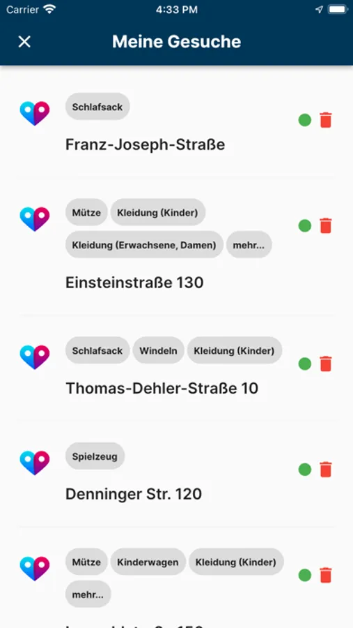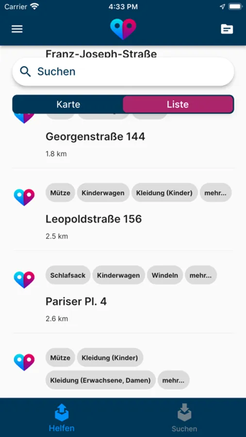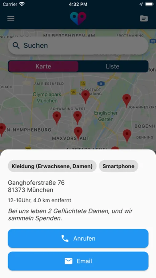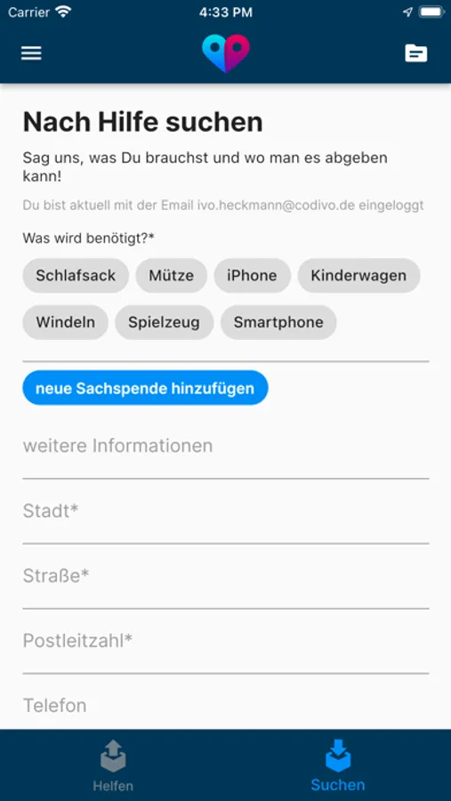 When you start the app, you can see the locations for donations in kind in the area and what is currently needed there. Organizations, but also private individuals who have taken in refugees, can enter what they need on a daily basis.